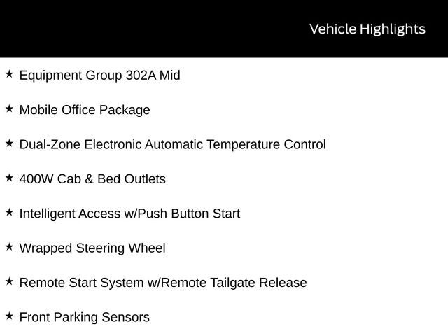 Factory MSRP: $61,465 $7,954 off MSRP! 2025 Ford F-150 XLT Black Metallic 4WD 10-Speed Automatic 3.5L PowerBoost Full-Hybrid V6 3.5L PowerBoost Full-Hybrid V6, 4WD, 360 Degree Camera, 400W Cab & Bed Outlets, 6 Angular Bright Anodized Step Bar, Adaptive Cruise Control w/Stop & Go, Auto-Dimming Rear-View Mirror, Chrome Door & Tailgate Handles, Chrome Single-Tip Exhaust, Cloth 40/Console/40 Front Seats, Connected Navigation, Console Worksurface, Driver State Detection, Dual-Zone Electronic Automatic Temperature Control, Equipment Group 302A Mid, Evasive Steering Assist, Ford Co-Pilot360 Assist 2.0, Front Parking Sensors, Heated Front Seats, Intelligent Access w/Push Button Start, LED Sideview Mirror Spotlights, Mobile Office Package, Power Glass Heated Sideview Mirrors, Remote Start System w/Remote Tailgate Release, SYNC 4 w/Enhanced Voice Recognition, Towing Technology, Wrapped Steering Wheel.