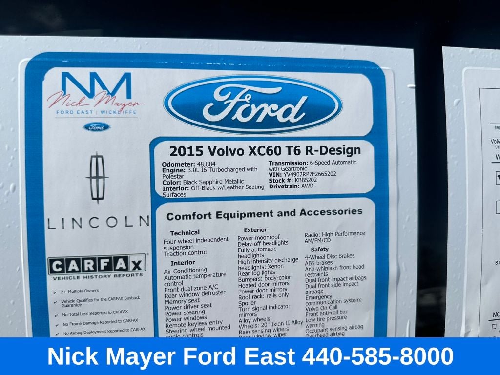 Nick Mayer Ford East Wickliffe is proud to offer this good-looking 2015 Volvo XC60 in Black Sapphire Metallic This vehicle has been thoroughly inspected, ready to take home, and comes with the following features; AWD, 4-Wheel Disc Brakes, 8 Speakers, ABS brakes, Air Conditioning, Alloy wheels, AM/FM radio: SIRIUS, Anti-whiplash front head restraints, Auto-dimming Rear-View mirror, Automatic temperature control, Brake assist, Bumpers: body-color, CD player, Delay-off headlights, Driver door bin, Driver vanity mirror, Dual front impact airbags, Dual front side impact airbags, Electronic Stability Control, Emergency communication system: Volvo On Call, Four wheel independent suspension, Front anti-roll bar, Front Bucket Seats, Front Center Armrest, Front dual zone A/C, Front Embossed R-Design Sport Seats, Front reading lights, Fully automatic headlights, Heated door mirrors, High intensity discharge headlights: Xenon, Illuminated entry, Leather Shift Knob, Low tire pressure warning, Memory seat, Navigation System, Occupant sensing airbag, Outside temperature display, Overhead airbag, Panic alarm, Passenger door bin, Passenger vanity mirror, Power door mirrors, Power driver seat, Power moonroof, Power passenger seat, Power steering, Power windows, Premium audio system: Volvo Sensus, R-Design Sport Leather Seating Surfaces, Radio data system, Radio: High Performance AM/FM/CD, Rain sensing wipers, Rear anti-roll bar, Rear fog lights, Rear reading lights, Rear seat center armrest, Rear window defroster, Rear window wiper, Remote keyless entry, Roof rack: rails only, Security system, Sensus Navigation with Mapcare, Speed control, Split folding rear seat, Spoiler, Sport steering wheel, Steering wheel mounted audio controls, Tachometer, Telescoping steering wheel, Tilt steering wheel, Traction control, Trip computer, Turn signal indicator mirrors, Variably intermittent wipers, and Wheels: 20 Ixion II Alloy.