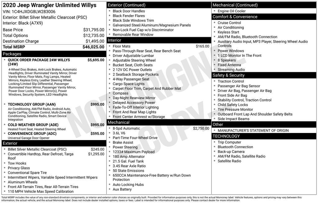 Nick Mayer Ford East Wickliffe is proud to offer this charming-looking and fun 2020 Jeep Wrangler in Billet Silver Metallic Clearcoat This vehicle has been thoroughly inspected, ready to take home, and comes with the following features; Cold Weather Group, Convenience Group, LED Headlamp & Fog Lamp Group (Front LED Fog Lamps), Quick Order Package 24W Willys (4-Wheel Drive Swing Gate Decal, Anti-Lock 4-Wheel Disc HD Brakes, Black Grille, Black Trail Rated Badge, Deep Tint Sunscreen Windows, Matte Black Jeep Badge, MOPAR All-Weather Floor Mats, Power Heated Mirrors, Remote Keyless Entry, Security Alarm, Speed Sensitive Power Locks, Willys, and Willys Hood Decal), Technology Group (7.0 Touchscreen Display, Integrated Center Stack Radio, Radio: Uconnect 4 w/7 Display, and SiriusXM Satellite Radio), 3.45 Rear Axle Ratio, 4-Wheel Disc Brakes, 8 Speakers, ABS brakes, Air Conditioning, AM/FM radio, Apple CarPlay (DISC), Aux Battery, Black 3-Piece Hard Top, Brake assist, Cloth Low-Back Bucket Seats, Compass, Delay-off headlights, Driver door bin, Driver vanity mirror, Dual front impact airbags, Dual front side impact airbags, Electronic Stability Control, Front anti-roll bar, Front Bucket Seats, Front Center Armrest w/Storage, Front fog lights, Front reading lights, Integrated roll-over protection, Integrated Voice Command w/Bluetooth®, Low tire pressure warning, Manufacturer's Statement of Origin, No Soft Top, Non-Lock Fuel Cap w/o Discriminator, Normal Duty Suspension, Occupant sensing airbag, Outside temperature display, ParkView Rear Back-Up Camera, Passenger door bin, Passenger vanity mirror, Power steering, Radio data system, Radio: Uconnect 3 w/5 Display, Rear anti-roll bar, Rear reading lights, Rear Window Defroster, Speed control, Split folding rear seat, Steering wheel mounted audio controls, Stop-Start Dual Battery System, Tachometer, Telescoping steering wheel, Tilt steering wheel, Traction control, Trip computer, Variably intermittent wipers, and Wheels: 17 x 7.5 Black Steel Styled.