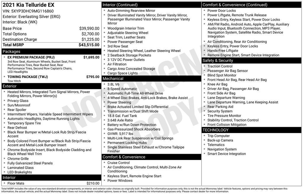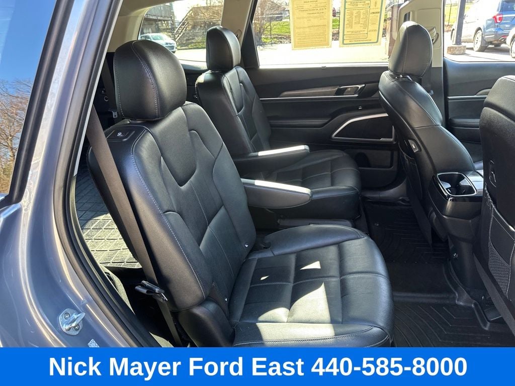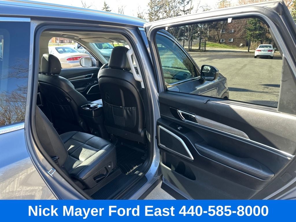 Nick Mayer Ford East Wickliffe is proud to offer this good-looking 2021 Kia Telluride in Everlasting Silver This vehicle has been thoroughly inspected, ready to take home, and comes with the following features; EX Premium Package (2nd Row Captain Chairs, LED Headlamps, Satin Chrome Roof Rails, and Wheels: 7.5 x 20 Machined Finish Alloy), Towing Package (Self Leveling Rear Suspension and Tow Hitch w/Harness (TOF)), 3.648 Axle Ratio, 3rd row seats: split-bench, 4-Wheel Disc Brakes, 6 Speakers, ABS brakes, Air Conditioning, Alloy wheels, AM/FM radio: SiriusXM, Apple CarPlay & Android Auto, Auto-dimming Rear-View mirror, Automatic temperature control, Brake assist, Bumpers: body-color, Carpeted Floor Mats, Compass, Delay-off headlights, Driver door bin, Driver vanity mirror, Dual front impact airbags, Dual front side impact airbags, Electronic Stability Control, Emergency communication system: 911 Connect, Four wheel independent suspension, Front anti-roll bar, Front Bucket Seats, Front Center Armrest, Front dual zone A/C, Front reading lights, Fully automatic headlights, Heated & Ventilated Front Bucket Seats, Heated door mirrors, Heated front seats, Heated steering wheel, Illuminated entry, Knee airbag, Leather Seat Trim, Leather Shift Knob, Leather steering wheel, Low tire pressure warning, Navigation System, Occupant sensing airbag, Outside temperature display, Overhead airbag, Overhead console, Panic alarm, Passenger door bin, Passenger vanity mirror, Power door mirrors, Power driver seat, Power Liftgate, Power moonroof, Power passenger seat, Power steering, Power windows, Radio data system, Radio: AM/FM/SIRIUS Display Audio, Rear air conditioning, Rear anti-roll bar, Rear audio controls, Rear reading lights, Rear seat center armrest, Rear window defroster, Rear window wiper, Reclining 3rd row seat, Remote keyless entry, Roof rack: rails only, Security system, Smart Key w/ Push Button and Remote Start, Speed control, Speed-sensing steering, Split folding rear seat, Spoiler, Steering wheel mounted audio controls, Tachometer, Telescoping steering wheel, Tilt steering wheel, Traction control, Trip computer, Turn signal indicator mirrors, Variably intermittent wipers, Ventilated front seats, and Wheels: 7.5 x 18 Machined Finish Alloy.