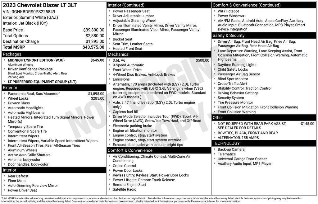 Powered by a robust 3.6L V6 engine, the Blazer LT delivers exceptional performance with 308 horsepower and 270 lb-ft of torque. The 9-speed automatic transmission with overdrive ensures a smooth, efficient ride, while the front-wheel-drive configuration provides confident handling and control.