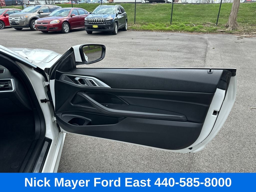 Nick Mayer Ford East Wickliffe is proud to offer this superb 2024 BMW 4 Series in Alpine White This vehicle has been thoroughly inspected, ready to take home, and comes with the following features; Connected Package Pro, 10 Speakers, 4-Wheel Disc Brakes, ABS brakes, Air Conditioning, Alloy wheels, AM/FM Radio, AM/FM radio: SiriusXM with 360L, Apple CarPlay & Android Auto Compatibility, Auto High-beam Headlights, Auto-dimming door mirrors, Auto-dimming Rear-View mirror, Automatic temperature control, BMW Assist eCall, BMW TeleServices, Brake assist, Bumpers: body-color, Compass, ConnectedDrive Services, Convertible roof lining, Convertible roof wind blocker, Delay-off headlights, Driver door bin, Driver vanity mirror, Dual front impact airbags, Dual front side impact airbags, Electronic Stability Control, Emergency communication system: BMW Assist eCall, Enhanced USB & Bluetooth® w/Smartphone Integration, Exterior Parking Camera Rear, Four wheel independent suspension, Front anti-roll bar, Front Bucket Seats, Front Center Armrest, Front dual zone A/C, Front reading lights, Fully automatic headlights, Garage door transmitter, Genuine wood console insert, Genuine wood dashboard insert, Glass rear window, Heated door mirrors, Hi-Fi Sound System, Illuminated entry, Integrated roll-over protection, Knee airbag, Leather steering wheel, Low tire pressure warning, Memory seat, Navigation, Navigation System, Occupant sensing airbag, Outside temperature display, Overhead console, Panic alarm, Passenger door bin, Passenger vanity mirror, Perforated SensaTec Upholstery, Power convertible roof, Power door mirrors, Power driver seat, Power Front Seats, Power passenger seat, Power steering, Power windows, Radio data system, Rain sensing wipers, Rear anti-roll bar, Rear reading lights, Rear seat center armrest, Rear window defroster, Remote keyless entry, Security system, SiriusXM w/360L, Speed control, Speed-sensing steering, Speed-Sensitive Wipers, Sport Seats, Sport steering wheel, Steering wheel mounted audio controls, Tachometer, Telescoping steering wheel, Tilt steering wheel, Traction control, Trip computer, Turn signal indicator mirrors, Variably intermittent wipers, Wheels: 18 x 7.5 V-Spoke Bi-Color Orbit Grey, and Widescreen Display.