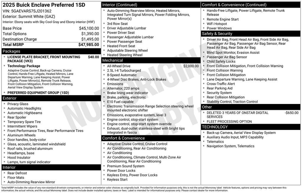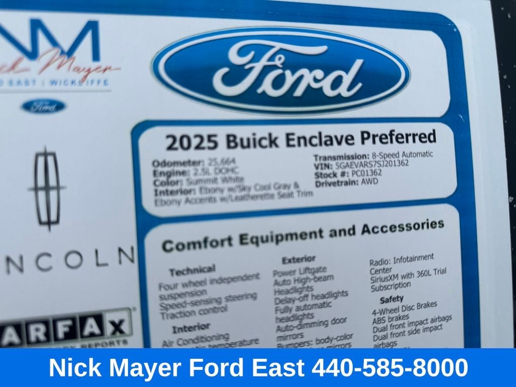 Nick Mayer Ford East Wickliffe is proud to offer this handsome 2025 Buick Enclave in Summit White This vehicle has been thoroughly inspected, ready to take home, and comes with the following features; AWD, 12 Speakers, 3rd row seats: split-bench, 4-Wheel Disc Brakes, ABS brakes, Air Conditioning, Alloy wheels, AM/FM radio: SiriusXM with 360L, Auto High-beam Headlights, Auto-dimming door mirrors, Auto-dimming Rear-View mirror, Automatic temperature control, Bose Premium 12-Speaker Audio System, Brake assist, Bumpers: body-color, Compass, Delay-off headlights, Driver 4-Way Power Lumbar Seat Adjuster, Driver 8-Way Power Seat Adjuster, Driver door bin, Driver vanity mirror, Dual front impact airbags, Dual front side impact airbags, Electronic Stability Control, Emergency communication system: OnStar and Buick connected services capable, Four wheel independent suspension, Front anti-roll bar, Front Bucket Seats, Front Center Armrest, Front dual zone A/C, Front Passenger 4-Way Power Lumbar Seat Adjuster, Front Passenger 6-Way Power Seat Adjuster, Front reading lights, Fully automatic headlights, Heated door mirrors, Heated Driver and Front Passenger Seats, Heated front seats, Heated steering wheel, Illuminated entry, Leather steering wheel, Leatherette Seat Trim, Low tire pressure warning, Navigation System, Occupant sensing airbag, Outside temperature display, Overhead airbag, Overhead console, Panic alarm, Passenger door bin, Passenger vanity mirror, Power door mirrors, Power driver seat, Power Liftgate, Power passenger seat, Power steering, Power windows, Premium audio system: Buick Infotainment System, Radio data system, Radio: Infotainment Center, Rear air conditioning, Rear anti-roll bar, Rear reading lights, Rear side impact airbag, Rear window defroster, Rear window wiper, Remote keyless entry, Security system, SiriusXM with 360L Trial Subscription, Speed control, Speed-sensing steering, Spoiler, Steering wheel mounted audio controls, Tachometer, Telescoping steering wheel, Tilt steering wheel, Traction control, Trip computer, Turn signal indicator mirrors, Variably intermittent wipers, Voltmeter, Wheels: 20 Alloy with Medium Android Finish, Wireless Apple CarPlay, and Wireless Google Android Auto.