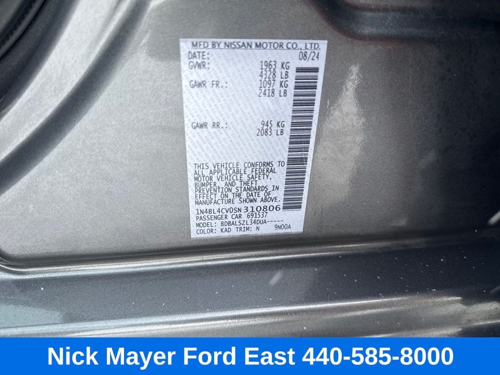 Nick Mayer Ford East Wickliffe is proud to offer this outstanding-looking 2025 Nissan Altima in Gun Metallic This vehicle has been thoroughly inspected, ready to take home, and comes with the following features; CVT with Xtronic, 4-Wheel Disc Brakes, 6 Speakers, ABS brakes, Air Conditioning, Alloy wheels, AM/FM radio: SiriusXM, Auto High-beam Headlights, Blind Spot Warning, Brake assist, Bumpers: body-color, Delay-off headlights, Driver door bin, Driver vanity mirror, Dual front impact airbags, Dual front side impact airbags, Electronic Stability Control, Four wheel independent suspension, Front anti-roll bar, Front Bucket Seats, Front Center Armrest, Front reading lights, Fully automatic headlights, Illuminated entry, Knee airbag, Leather Shift Knob, Low tire pressure warning, NissanConnect featuring Apple CarPlay and Android Auto, Occupant sensing airbag, Outside temperature display, Overhead airbag, Overhead console, Panic alarm, Passenger door bin, Passenger vanity mirror, Power door mirrors, Power driver seat, Power steering, Power windows, Radio data system, Radio: AM/FM Audio System, Rear anti-roll bar, Rear Parking Sensors, Rear reading lights, Rear seat center armrest, Rear side impact airbag, Rear window defroster, Remote keyless entry, Security system, Speed control, Speed-sensing steering, Speed-Sensitive Wipers, Split folding rear seat, Sport Seat Trim, SR Floor Mats/Trunk Mat/Hideaway Nets, Steering wheel mounted audio controls, Tachometer, Telescoping steering wheel, Tilt steering wheel, Traction control, Trip computer, Unique Sport Seats, Variably intermittent wipers, and Wheels: 19 Sport Machined Alloy.
