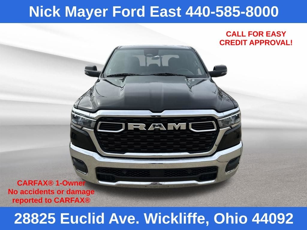 Nick Mayer Ford East Wickliffe is proud to offer this stunning-looking 2025 Ram 1500 in Diamond Black Crystal Pearlcoat This vehicle has been thoroughly inspected, ready to take home, and comes with the following features; Big Horn Level 2 Equipment Group (115V Auxiliary Power Outlet, 115V Auxiliary Rear Power Outlet, 12 Touchscreen Display, 2nd Row In Floor Storage Bins, 400W Inverter, 4G LTE Wi-Fi Hot Spot, 9 Amplified Speakers w/Subwoofer, Air Conditioning ATC w/Dual Zone Control, Apple CarPlay, Auto Power-Folding Mirrors, Auto-Dimming Exterior Driver Mirror, Auto-Dimming Rear-View Mirror, Black Exterior Mirrors, Black Premium Power Mirrors, Cluster 7.0 TFT Color Display, Configurable Drive Mode, Connected Travel & Traffic Services, Connectivity - US/Canada, Convex Wide-Angle Exterior Mirror Insert, Exterior Mirrors Courtesy Lamps, Exterior Mirrors w/Heating Element, Exterior Mirrors w/Supplemental Signals, Glove Box Lamp, Google Android Auto, GPS Antenna Input, GPS Navigation, HD Radio, Heated Front Seats, Heated Steering Wheel, Integrated Voice Command w/Bluetooth®, Leather Wrapped Steering Wheel, LED Dome Lamp w/On/Off Switch, LED Footwell Lighting, Media Hub w/2 Charge Only USBs, Overhead LED Lamps, Power 2-Way Driver Lumbar Adjust, Power Adjust 8-Way Driver Seat, Power Adjustable Pedals, Premium Overhead Console, Radio: Uconnect 5 Nav w/12.0 Display, Rear Power Sliding Window, Rear Window Defroster, Remote Tailgate Release, Security Alarm, SiriusXM w/360L, Steering Wheel Mounted Audio Controls, Sun Visors w/Illuminated Vanity Mirrors, Universal Garage Door Opener, and USB Host Flip), Quick Order Package 21Z Big Horn, 3 Rear Seat Head Restraints, 3.21 Rear Axle Ratio, 3.55 Rear Axle Ratio, 4 Way Front Headrests, 4-Wheel Disc Brakes, 6 Speakers, ABS brakes, Air Conditioning, Alloy wheels, AM/FM radio, Apple CarPlay/Android Auto, Auto High-beam Headlights, Brake assist, Bumpers: chrome, Cloth Bench Seat, Compass, Delay-off headlights, Driver door bin, Dual front impact airbags, Dual front side impact airbags, Electronic Stability Control, Front anti-roll bar, Front Center Armrest w/Storage, Front fog lights, Front License Plate Bracket, Front reading lights, Front Seat Back Map Pockets, Front wheel independent suspension, Fully automatic headlights, Heated door mirrors, Illuminated entry, Low tire pressure warning, Manual Adjust 4-Way Front Passenger Seat, Manual Folding Exterior Mirrors, Manufacturer's Statement of Origin, Occupant sensing airbag, Outside temperature display, Overhead airbag, Overhead console, Panic alarm, ParkView Rear Back-Up Camera, Passenger door bin, Passenger vanity mirror, Power door mirrors, Power steering, Power windows, Radio data system, Radio: Uconnect 5 W w/8.4 Display, RAM Grille Badge - Chrome, Rear 60/40 Folding Seat, Rear anti-roll bar, Rear seat center armrest, Rear step bumper, Remote keyless entry, Speed control, Split folding rear seat, Supplier Part Tracking (J-1), Tachometer, Telescoping steering wheel, Tilt steering wheel, Traction control, Trip computer, Variably intermittent wipers, Voltmeter, and Wheels: 18 x 8 Cast-Aluminum Painted.
